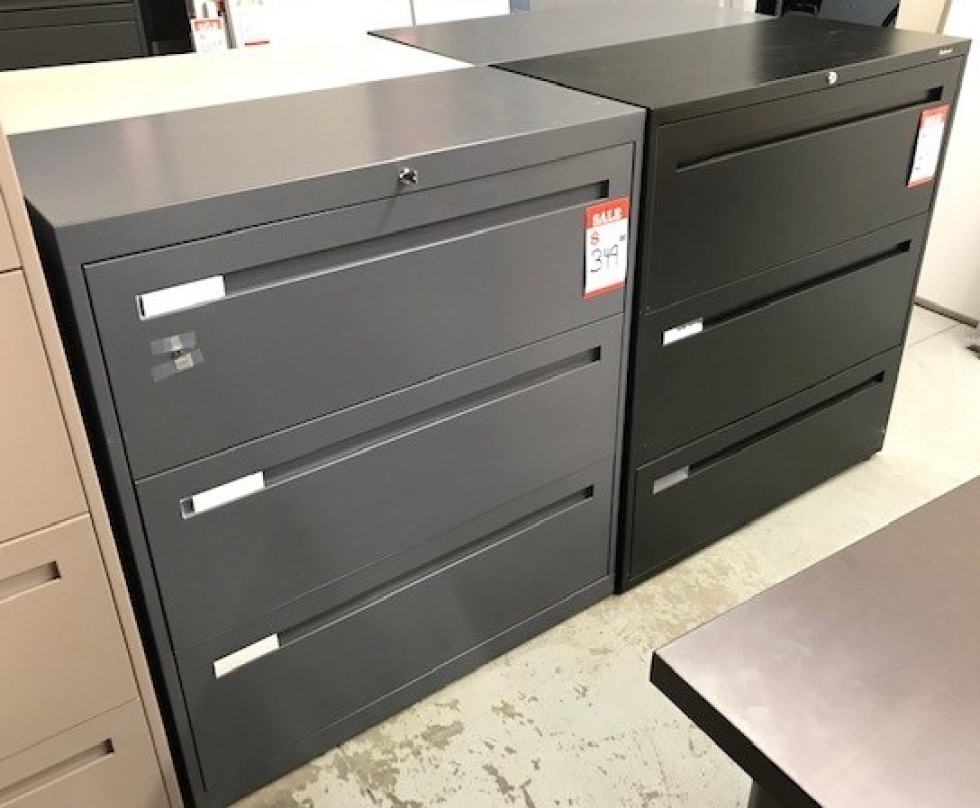 Global Boulevard Three Drawer Lateral File, 36" wide x 18" deep x 44" high. Colours available: Charcoal and Black. Quantity: Several