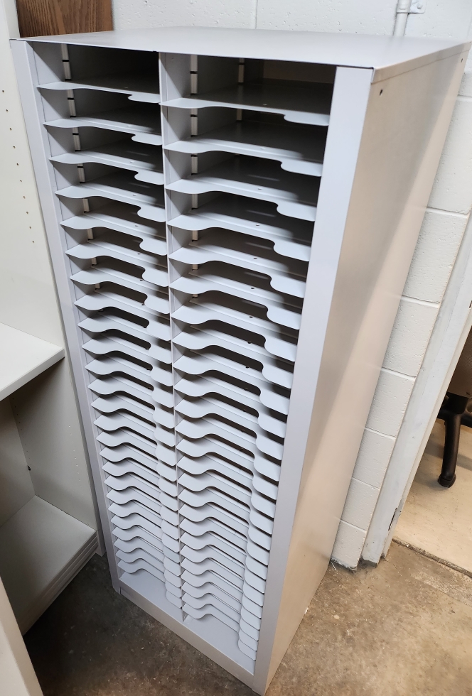 Metal Document Rack. 22" wide x 18" deep x 60" high. 52 Slots. Colour: Grey