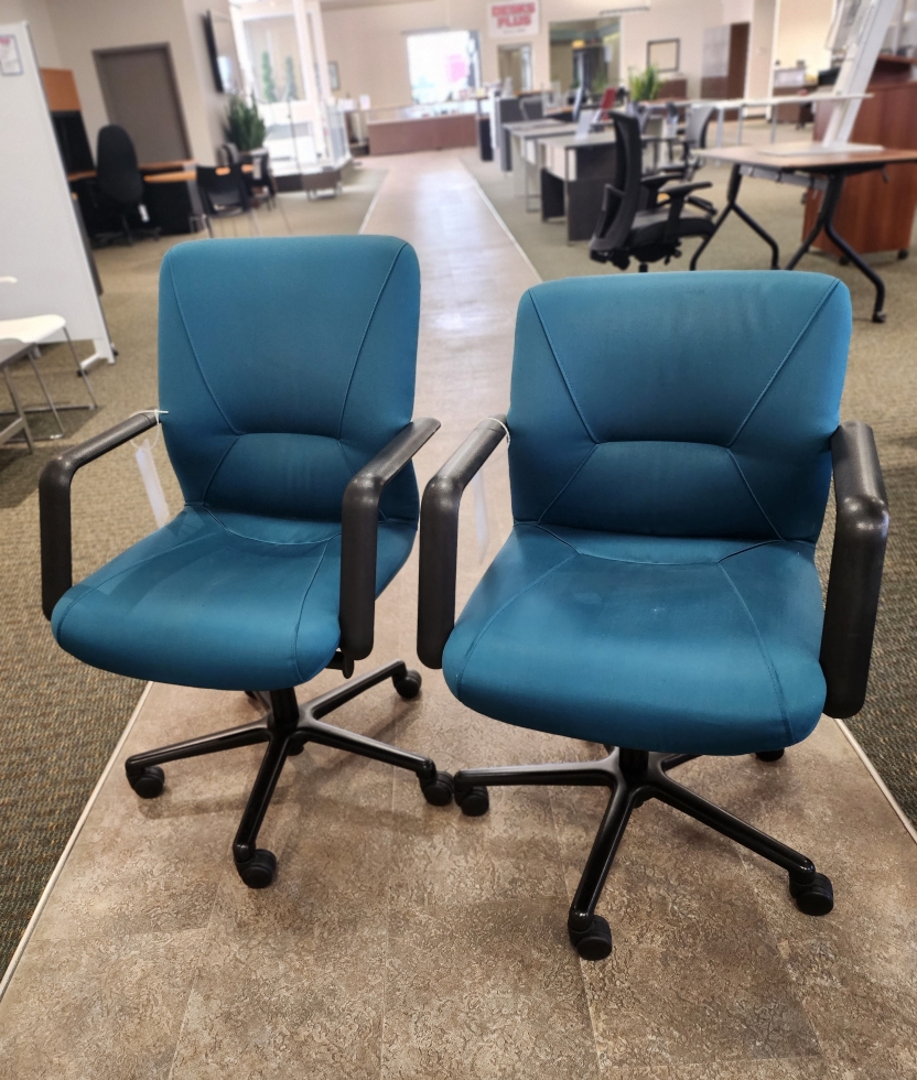 Low and Mid Back Chairs with black fixed arms and frame. Quantity 3 (asst) Fabric: Aqua Green. Price: $99.00 each