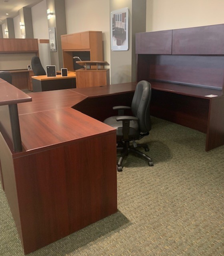 Links U-Shape Reception Desk, 84" wide x 126" deep, includes Back Upper Closed Hutch and Transaction Top Front Desk with Box/Box/File Pedestal. Finish - Mahogany