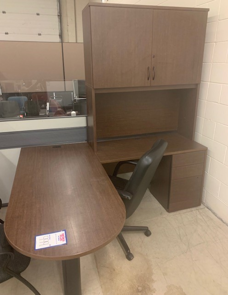 Global Zira Series L-Shape Workstation, 66" wide x 78" deep, Includes Front Island, Box/Box/File Pedestal and Closed Hutch. Finish- Tiger Walnut