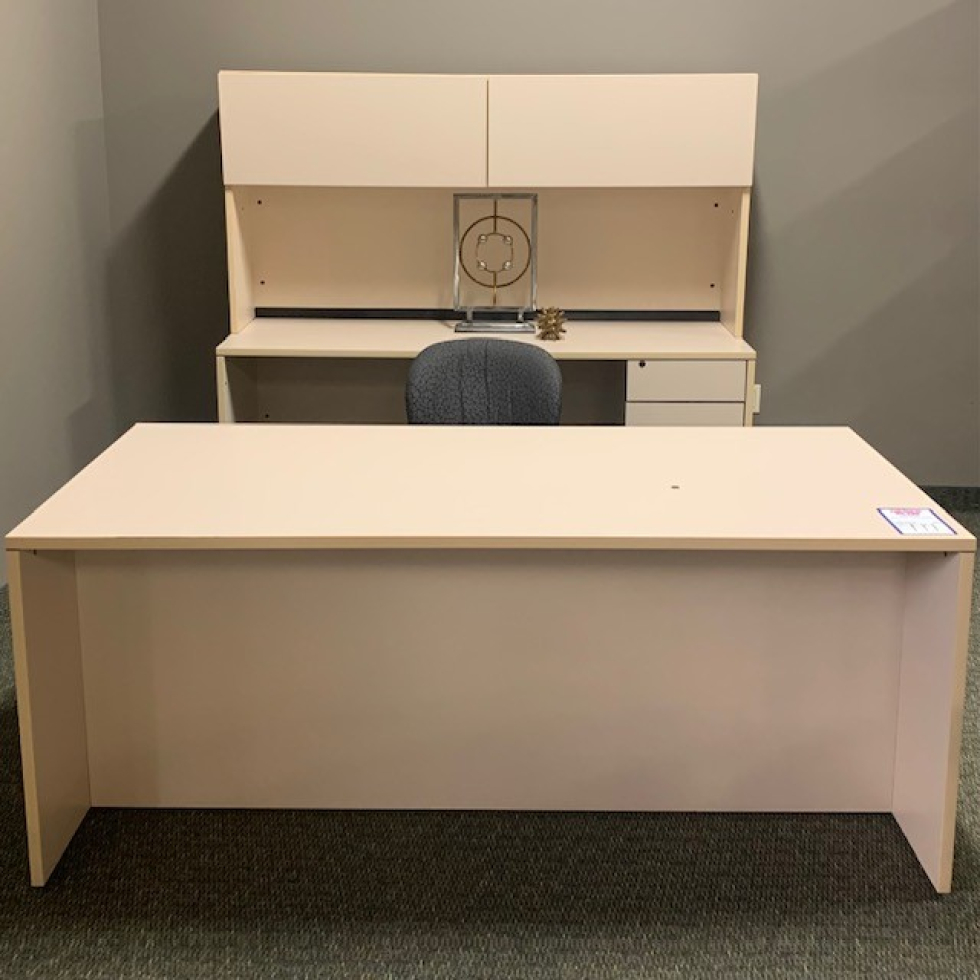 Desk and Credenza Package, Includes Rectangular Desk 72" wide x 36" deep with Single Left Box/Box Pedestal with Pull-Out Keyboard Tray. Also includes Rectangular Credenza 72" wide x 24" deep with Upper Closed Hutch and Single Right Box/File Pedestal. Finish Cream